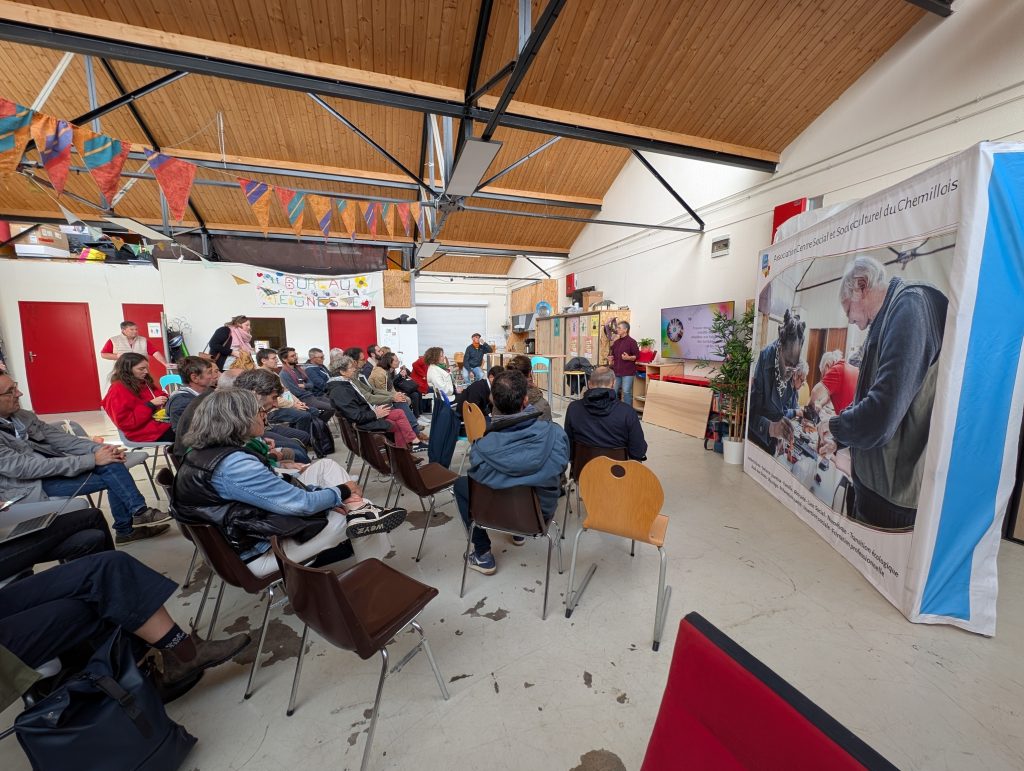 Yvan, du Centre Social du Chemillois, a présenté une démarche complémentaire : celle de la fabrication d’un véhicule intermédiaire au sein du fablab local : Le Vhélio (retour sur sa fabrication).