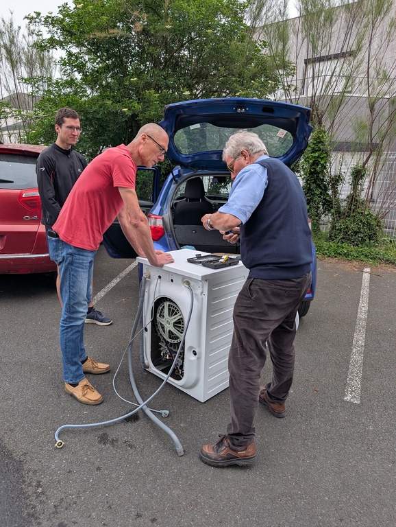 - Une centrale vapeur dont la pièce défaillante a été identifiée sur le site du fabricant (le propriétaire va la commander et reviendra au prochain Repair Café pour la faire changer). Ce suivi dans le temps, c’est l’une des choses qui font la singularité des Repair Café locaux 🙂