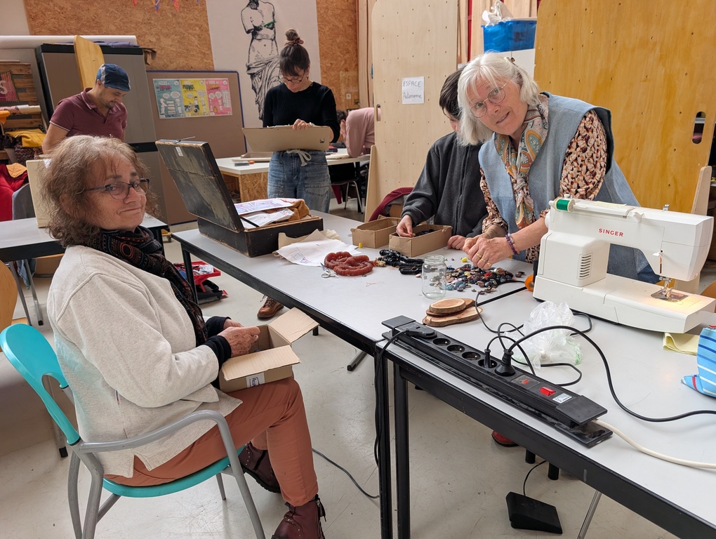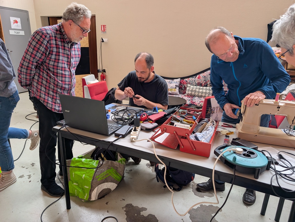 La vedette de la séance, c’était sans conteste la machine à coudre. Pas une, pas deux, pas trois ! Mais quatre machines à coudre sont arrivées ce matin-là, toutes des Singer. La plus ancienne avait 60 ans. Elle repart avec son plastique recollé et son transfo rechargé. Les bénévoles réparateur·rices textiles en ont vu d’autres, mais là, ils ont apprécié le défi.